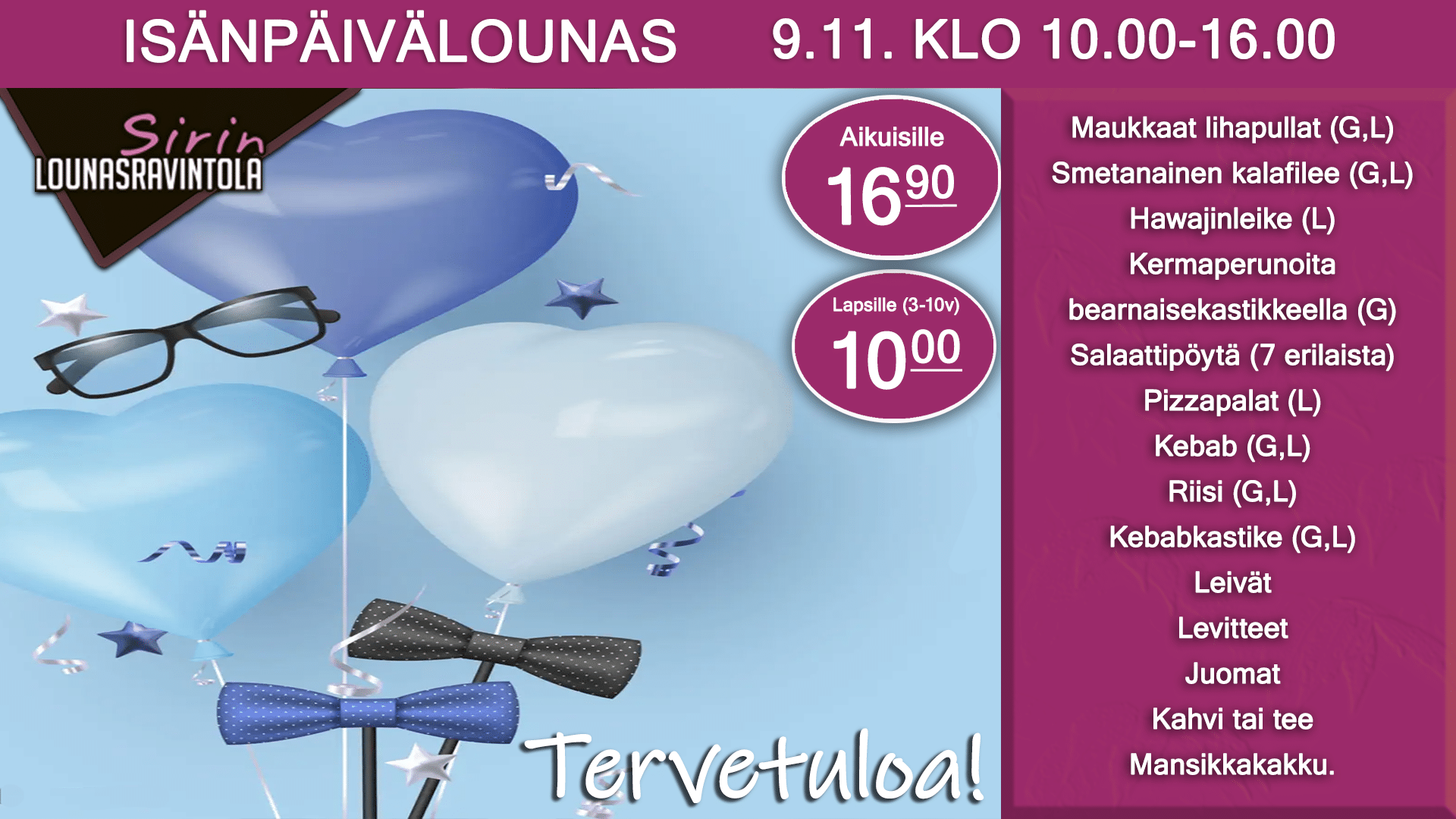 Pizzat (L), Kebab (G,L), Riisi (G,L), Salaattipöytä, Juomat, Leivät, Levitteet, Kahvi tai Tee ja Jälkiruoka.